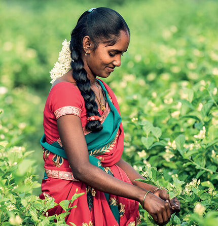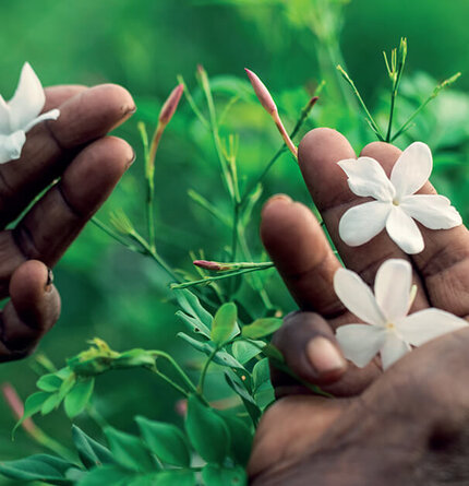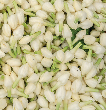 From May to December, the fields of India are fragrant with blooming jasmine, but the main season for the harvest is from July to September. Since the scent of jasmine is at its fullest at dawn, before the sun can alter its power, the harvest takes place in the early hours of the morning. Each flower is plucked one by one to avoid damaging the delicate petals, by the deft, delicate fingers of women in colorful saris.