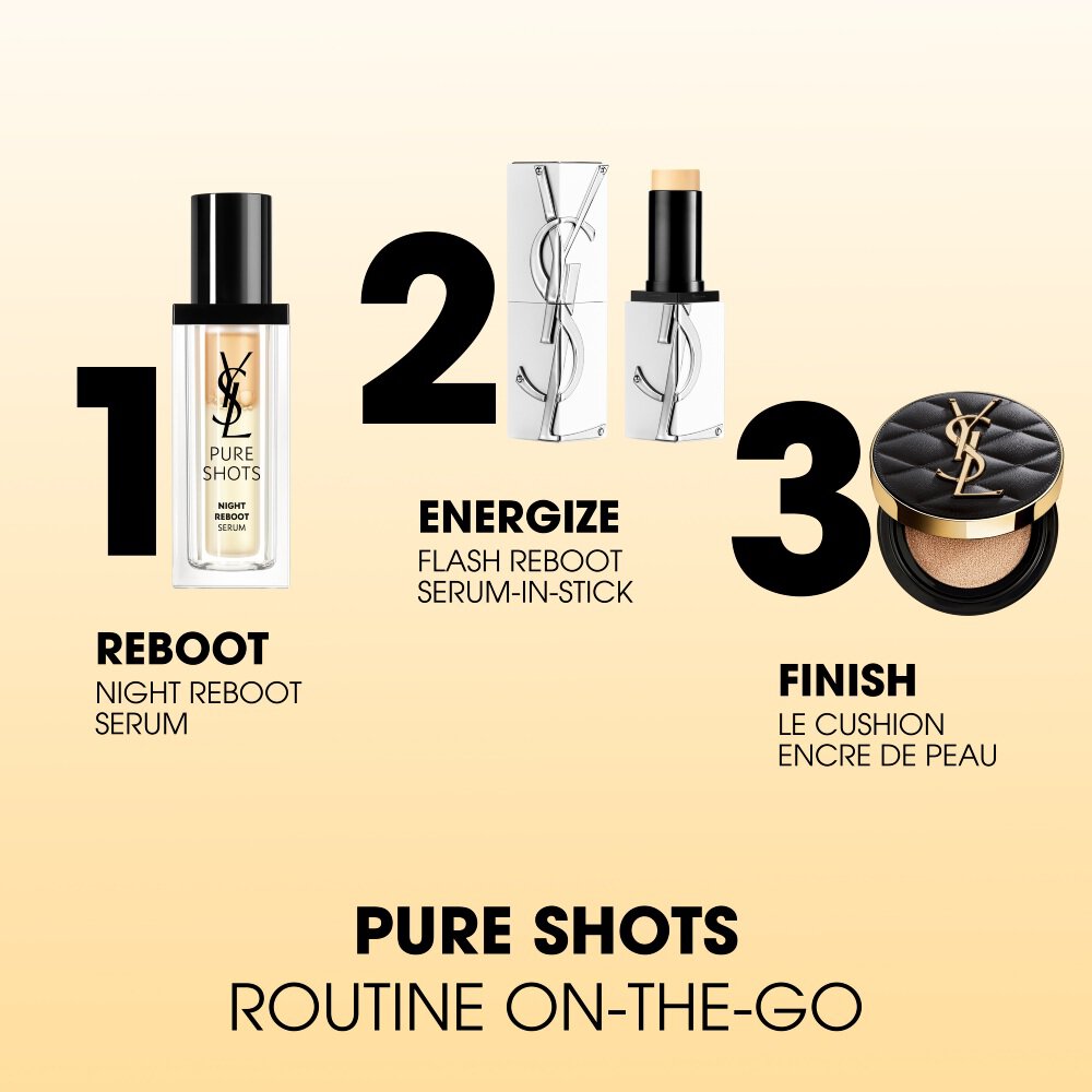 YSL Beauty's Pure Shots range is centred around powerful, fast-acting skin benefits. The Flash Reboot serum-in-stick delivers a peptide complex for ultimate firming action. Vitamins B3, B5 and E provide radiance, soothing, and antioxidant properties.